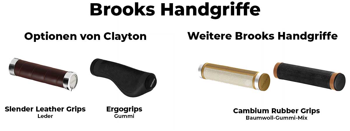 Für die Lenkergriffe gibt es von Clayton die Option der Ergogrips von Brooks, die nicht nur lederfrei, sondern auch sehr viel komfortabler sind. Du hast diese ja ebenfalls weiter oben schon gesehen.