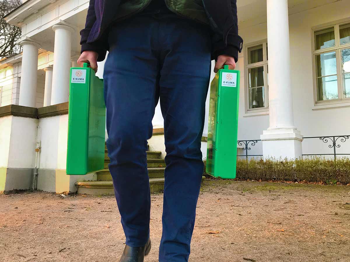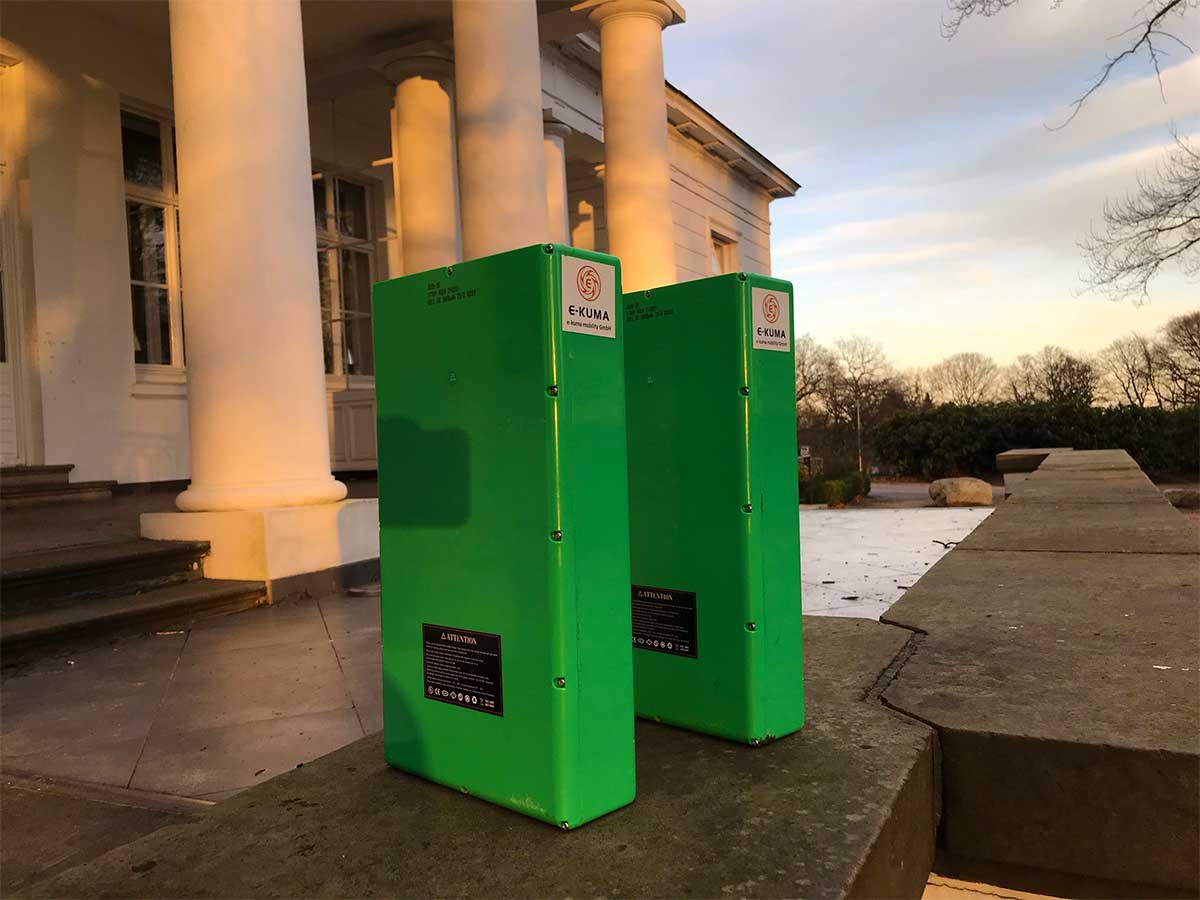 - Bei Modellen mit entnehmbaren Batterien (wie dem e-kuma SUN 3000W) kannst Du die Batterien bequem mit in die eigene Wohnung nehmen und dort an der eigenen Steckdosen (hoffentlich mit Ökostrom) aufladen.