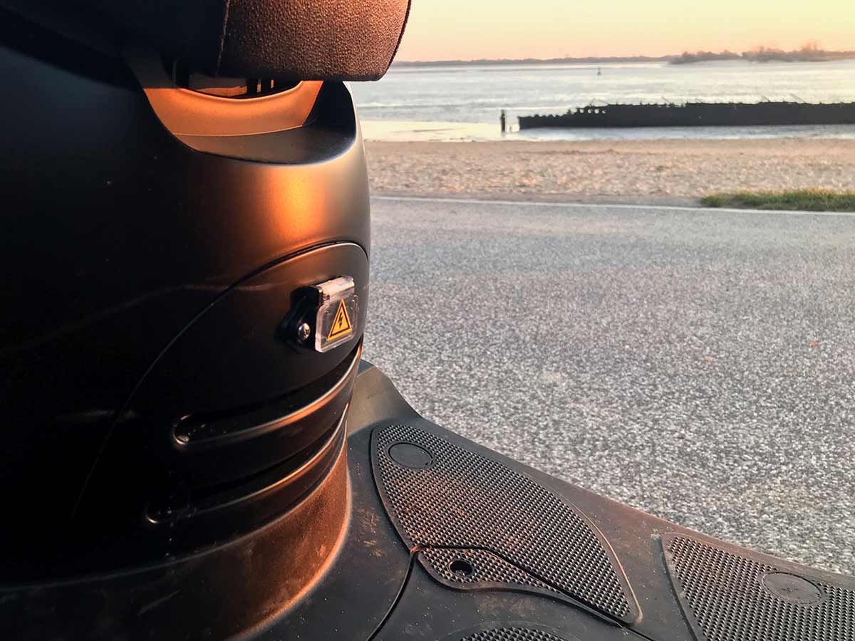 Du siehst, ob der Blinker blinkt und auch auf welcher Seite. Das kann nützlich sein, wenn Du mit dicken Handschuhen nicht sicher bist, ob Du den Blinker wirklich gesetzt hast. Denn der Blinker macht nicht wie die meisten anderen Roller ein „Blink-Geräusch“.
