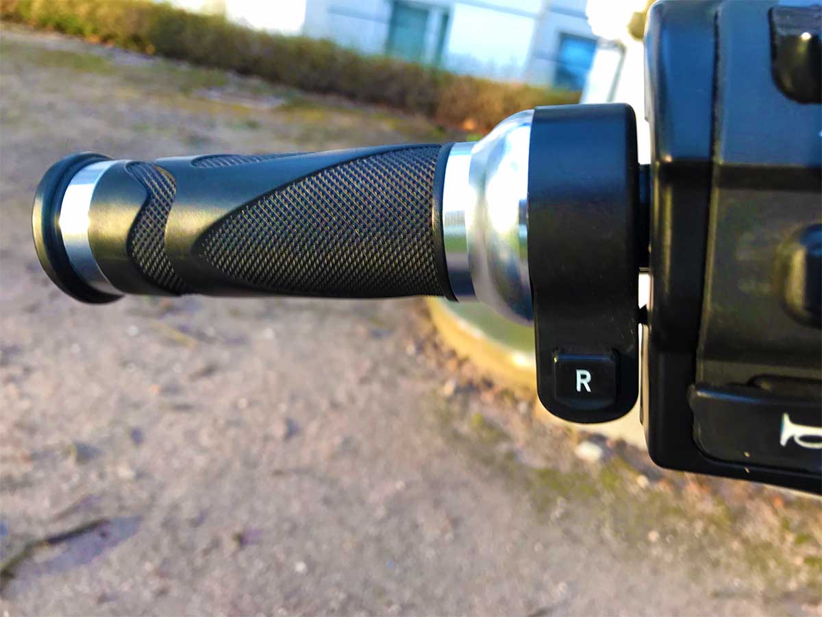 Wenn Du im Stand den R-Knopf am linken Griff gedrückt hältst und dann „Strom“ gibst, schiebt der Roller sanft Rückwärts.