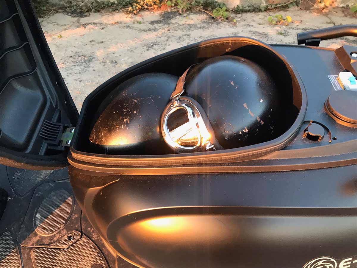 Uns gefällt auch, dass er ein Handschuhfach (mit USB-Ladebuchse) hat, und die Möglichkeit ein paar kleine Dinge, trotz der Batterien, mit unter der Sitzbank unter zu bringen.