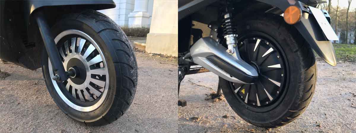 Bei einem e-Motorroller sind die beiden häufigsten Motorvarianten: Radnabenmotor (die meisten) oder Mittelmotor mit Ketten- oder Riemenantrieb.